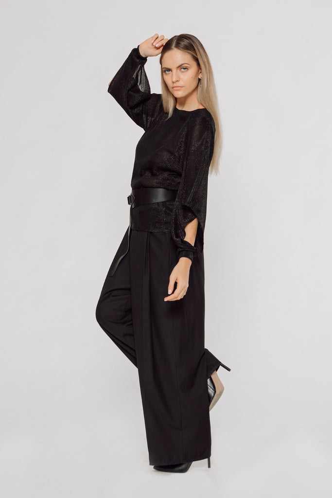 MaxmouderHigh-waisted fluid wide leg pants with double front pleats, designed with front side pockets and back false welt pocket, front zip, button closure and front pleat.